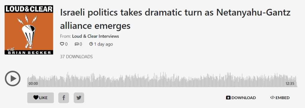 Listen below to my recent appearance on Brian Becker’s Podcast, “Loud & Clear” to discuss the Benjamin Netanyahi-Benny Gantz political alliance.