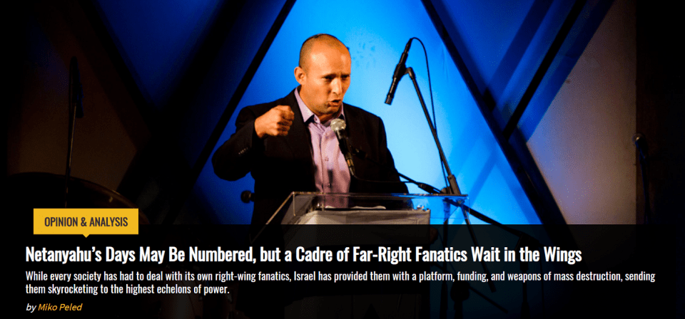 While every society has had to deal with its own right-wing fanatics, Israel has provided them with a platform, funding, and weapons of mass destruction, sending them skyrocketing to the highest echelons of power.