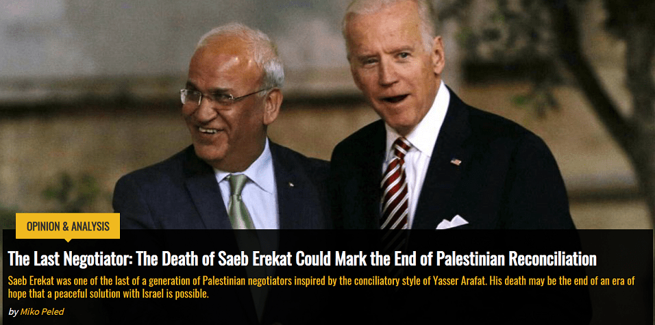 Saeb Erekat was one of the last of a generation of Palestinian negotiators inspired by the conciliatory style of Yasser Arafat. His death may be the end of an era of hope that a peaceful solution with Israel is possible.