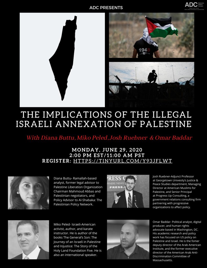 The ADC is a civil rights organization committed to defending the rights of people of Arab descent and promoting their rich cultural heritage. In this ADC hosted online event, The Implications of the Illegal Israeli Annexation of Palestine, the panel consisted of Diana Buttu, Josh Reubner, Omar Baddar, and Miko Peled