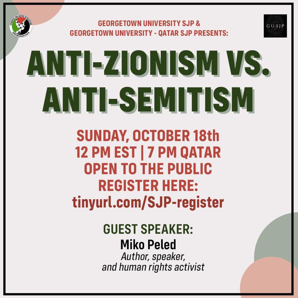 Join us for an honest discussion about the differences between Anti-Semitism and Anti-Zionism, and why this distinction is important. The event will be led by Jerusalem-born activist, author, and social justice advocate Miko Peled, and sponsored by Georgetown Main Campus & Qatar’s SJP chapters. A Q&A session will follow.