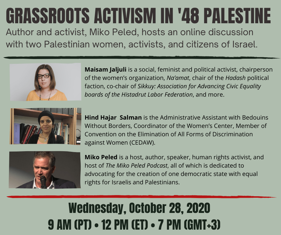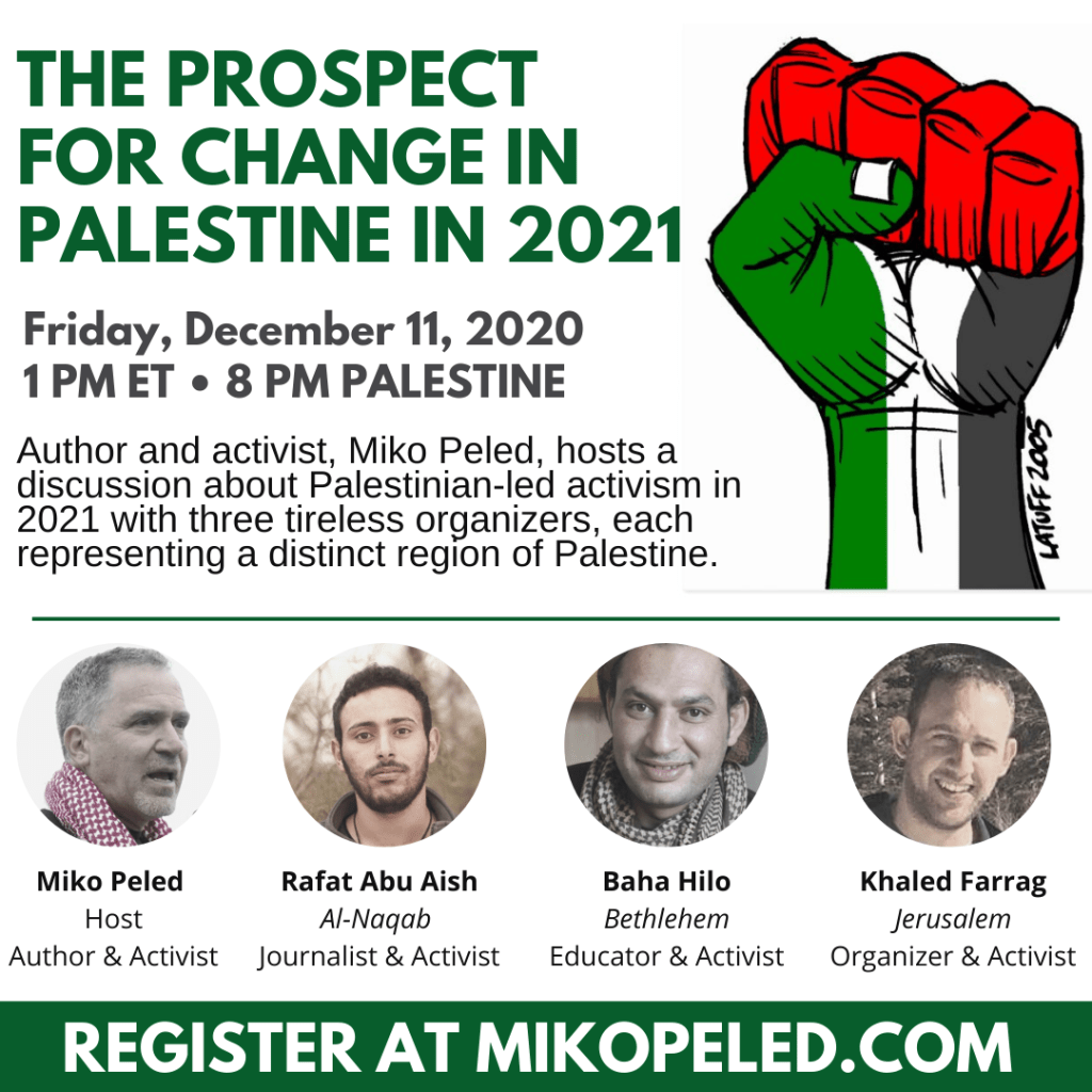 Author and activist, Miko Peled, hosts a discussion about Palestinian-led activism in 2021 with three tireless organizers, each representing a distinct region of Palestine: Al-Naqab desert, the West Bank, and Jerusalem. The four will discuss the prospect for change in the upcoming year as the role of grassroots activism and popular movement building becomes one of the few vehicles for enacting material change on the ground for Palestinian civil society.