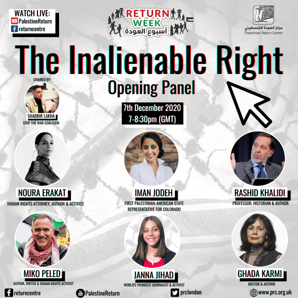 Join us for the first annual Return Week, which will be opened by a distinguished panel of speakers who will be speaking specifically on the inalienable Palestinian right of return. Watch online on Facebook live at Palestinian Return Centre.