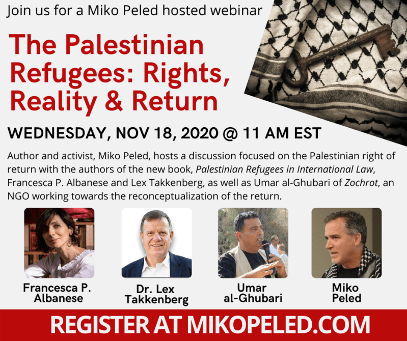 Author and activist, Miko Peled, hosts a discussion focused on the Palestinian right of return with the authors of the new book, Palestinian Refugees in International Law, Francesca P. Albanese and Lex Takkenberg, as well as Umar al-Ghubari of Zochrot, an NGO working towards the reconceptualization of the return.