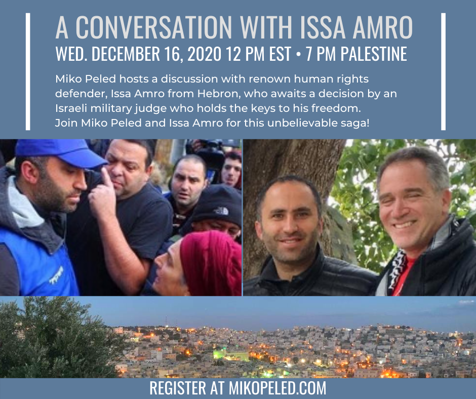 Author and activist, Miko Peled, hosts a discussion with renown Palestinian human rights defender, Issa Amro, who has been the target of routine Israeli state persecution and is currently awaiting a decision by the Israeli military court which could lead to his conviction and imprisonment.