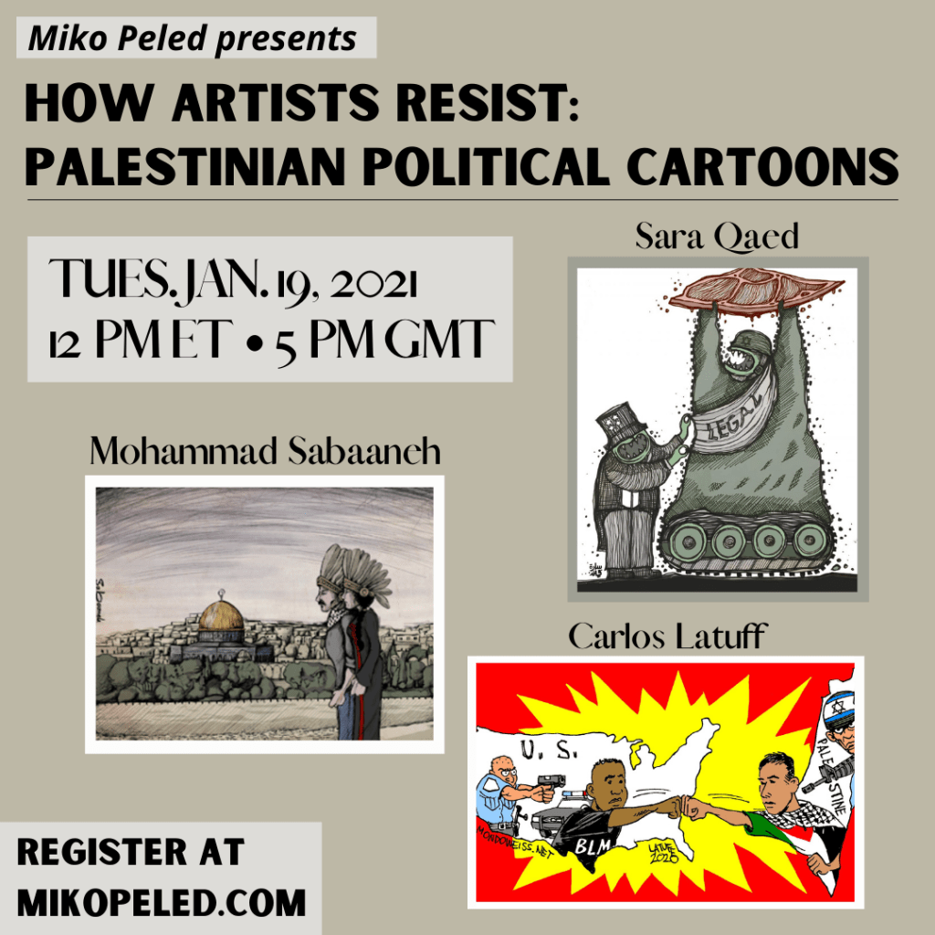 Author and activist, Miko Peled, hosts three brilliant cartoonists who have directed their art at highlighting the spirit of Palestinian resistance in the face of a brutal Israeli regime. Join us for a discussion with Sara Qaed, Mohammad Sabaaneh, and Carlos Latuff about the power of cartoons, Palestine’s rich history of the arts, and how each artist approaches their work.