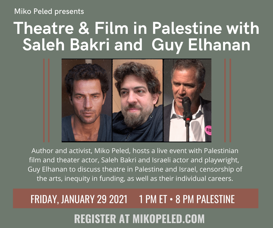 Author and activist, Miko Peled, hosts a live event with Palestinian film and theater actor, Saleh Bakri and Israeli actor and playwright, Guy Elhanan to discuss theatre in Palestine and Israel, censorship of the arts, inequity in funding, as well as their individual careers.